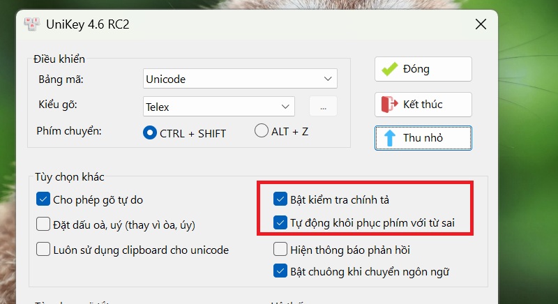 - Cho phép gõ tắt / Tự động khôi phục phím với từ sai