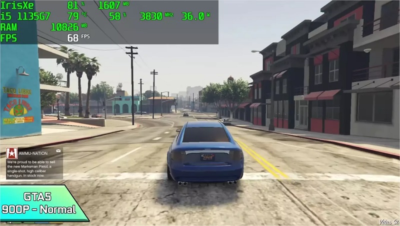 Khi trảu nghiệm thức tế Core i5 Tiger Lake 1135G7 trên tựa game GTA 5 ổn định ở mức FPS 68 mượt mà không giật lag.
